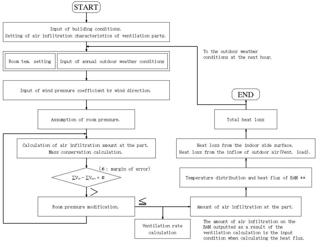 To predict the natural ventilation rate when using a BAM, the pressure judgment method or network method may be used [13]. The annual ventilation rates can also be calculated using air temperature, wind velocity, and wind direction with respect to time. Furthermore, heat flow through the BAMs under conditions of air infiltration with calculated using the numerical models for heat and air movements presented in the previous section.