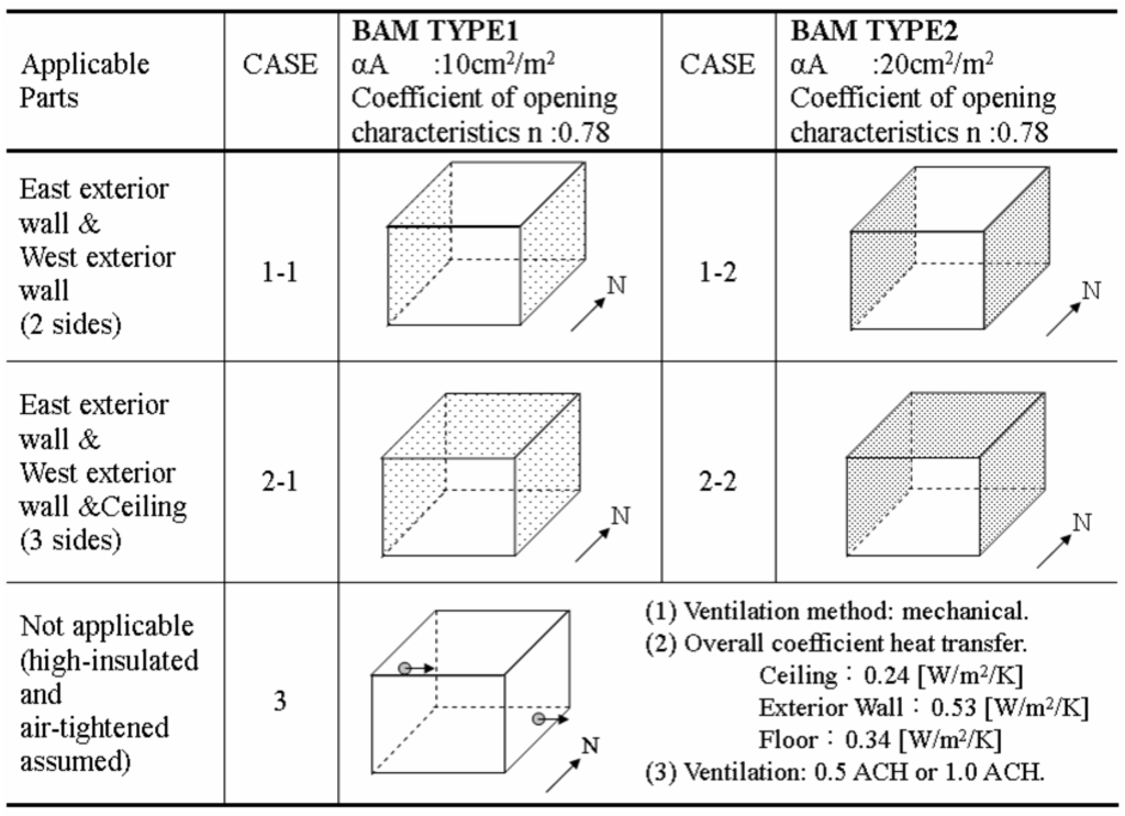 In Case 3, which utilized mechanical ventilation, a ventilation rate of 1.0 ACH, (equivalent to the average ventilation rates of Cases 1-2 and 2-1), the performance was such that total heat loss in Cases 1-2, 2-1 and, 2-2 (with BAMs) was reduced by 15.3%–40.2%. This confirms, the energy saving effect of the BAM.