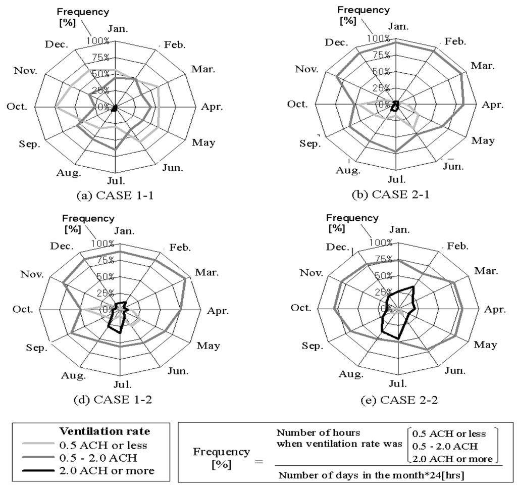 The annual natural ventilation rates were calculated for scenarios with BAMs installed in the exterior walls and ceilings of houses in the Tokyo area. Themonthly results were organized according to ACH rates of <0.5, 0.5–2.0, and >2.0 (see Figure 11).