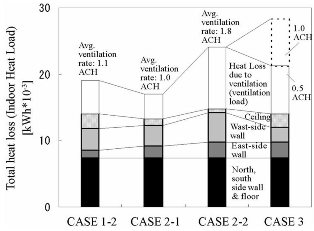 Figure 12 shows the calculated total heat loss between December and February (winter season) for Cases 1-2, 2-1, 2-2 and 3, in which BAMs were installed in two exterior walls using the most basic method.