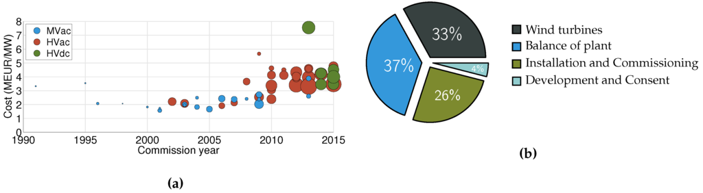Cost of power (COP) and capital expenditure (CAPEX) breakdown of offshore wind farms (OWFs). (a) COP of the European OWFs composed of five or more turbines [10,11]. Circle size represents the installed capacity of the OWFs. The monetary values were updated considering a Eurozone inflation of 1.85% [12]; (b) Typical CAPEX breakdown of an OWF [13].