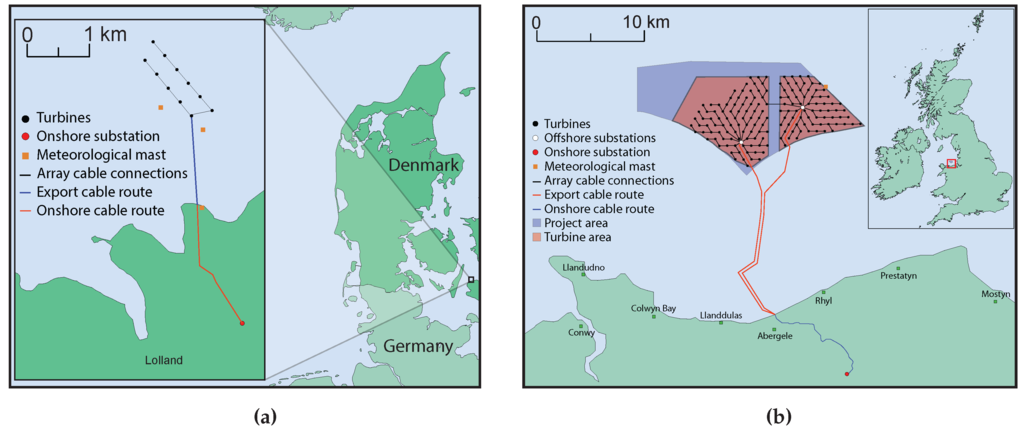 Differences in topology and design complexity between two OWFs. (a) Vindeby wind farm [10]; (b) Gwynt y Môr wind farm [23].