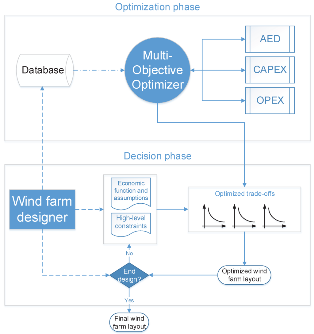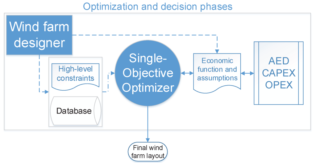 Figure 4 shows the current optimization strategy used by wind farm designers. The main disadvantage of this approach is that, by varying the economic factors, e.g., interest rate and price of energy, of the objective functions, it is not guaranteed that the layout solution remains the most advantageous. In fact, optimization strategies that optimize economic functions such as the LCOE or the NPV, may be thought as weighted optimization procedures, in which a MO problem is simplified into a single problem one.