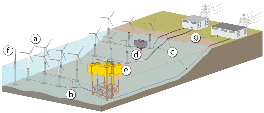 Main components of an OWF: (a) Wind turbines; (b) Collection cables; (c) Export cables; (d) Transformer station; (e) Converter station; (f) Meteorological mast; (g) Onshore stations.