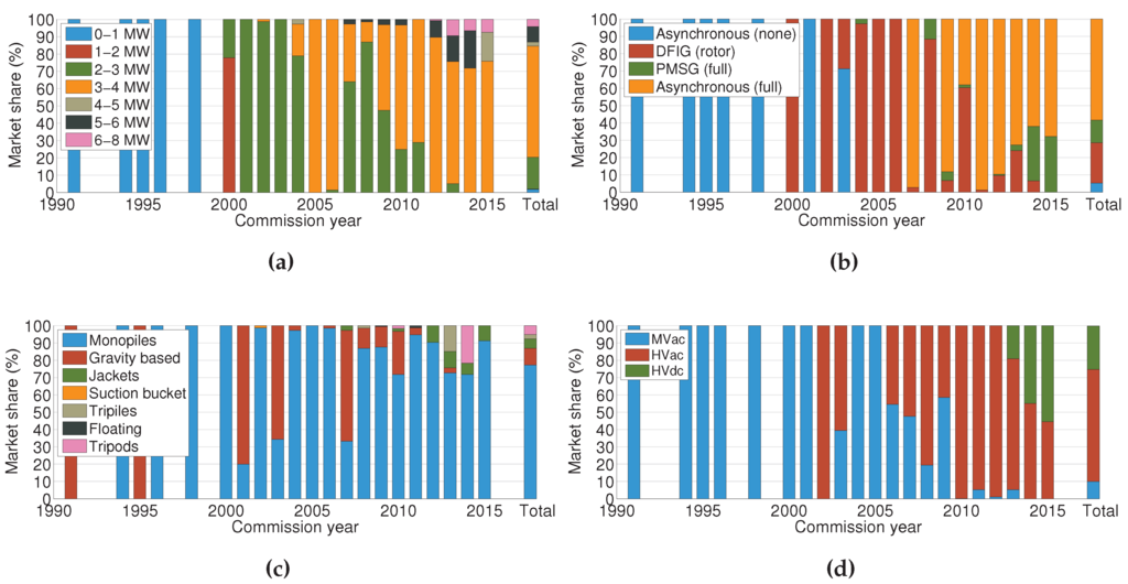 Figure 7 shows that the rated power, rotor diameter and hub height of offshore wind turbines is increasing since the initial projects. The average turbine rated power installed between 2012–2014 rounded the 4 MW mark (see Figure 8a) [53]. This means that, generally, the offshore wind industry prefers larger wind turbines.