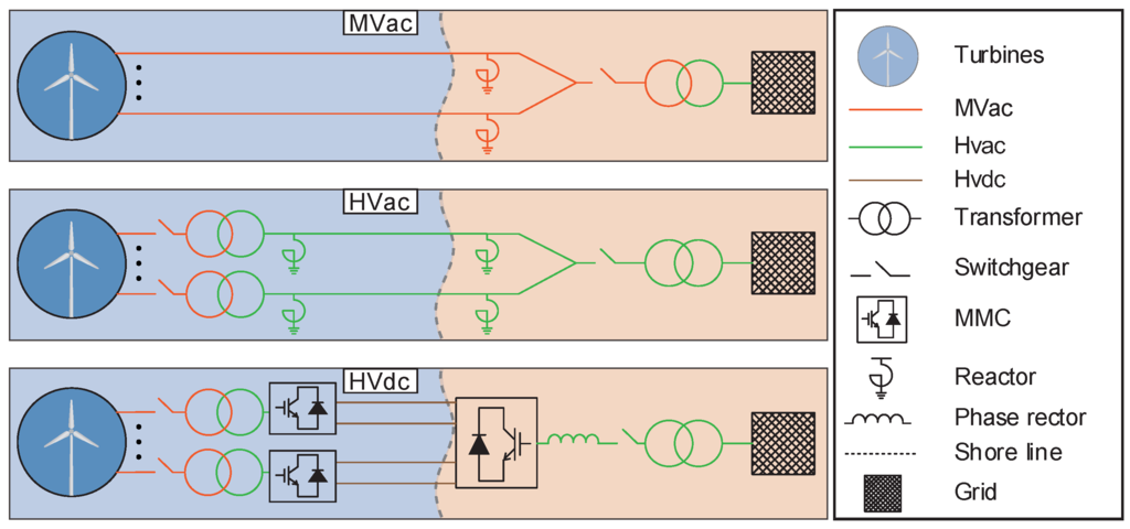- Lluch, J.R. Power Transmission Systems for Offshore Wind Farms Technical-Economic Analysis. Master’s Thesis, Universitat Politcnica de Catalunya, Barcelona, Spain, 2015. [Google Scholar]