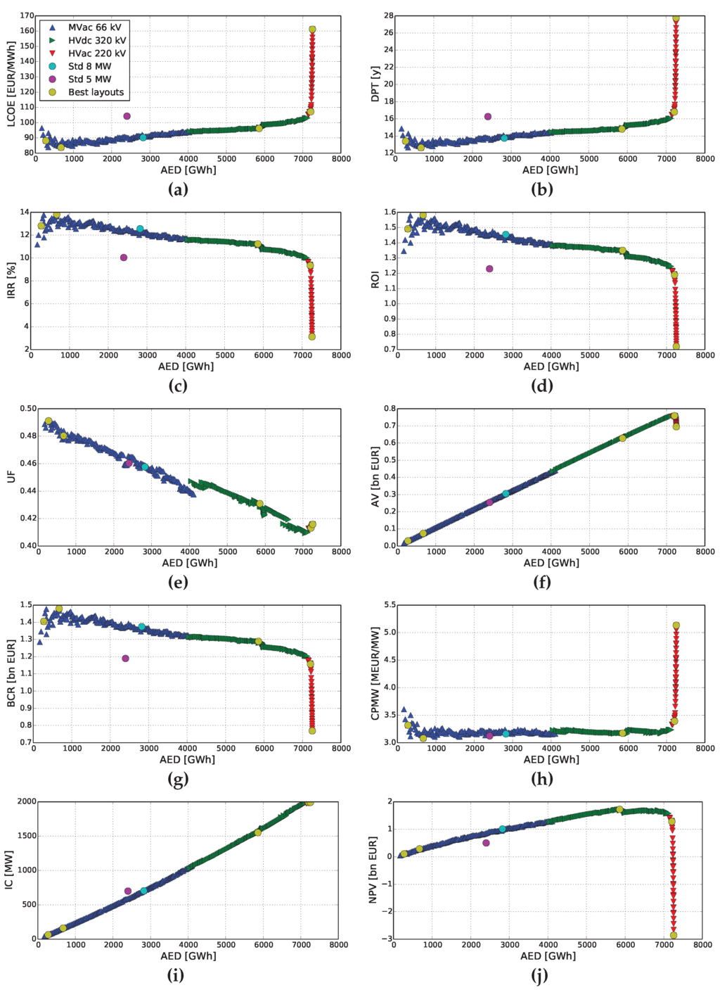 Maximizing the annual energy production (AEP) (GWh/year) is among the most common goals [25] and aims at maximizing the AEP of the wind turbines. Another more comprehensive goal is to maximize the annual energy delivered (AED) (GWh/year) to the onshore electrical network. This goal covers the AEP but also the electrical losses through the entire system, e.g., transformers and cabling systems. Nonetheless, these goals do not take into consideration costs associated with the project or the efficiency of the project.