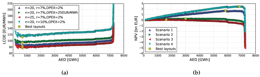 All economic functions used to evaluate the profitability of OWFs have the same backbone variables: the AED, CAPEX and OPEX. They were the chosen as optimization goals because they retain their original function direction when optimizing any economic function. In other words, to optimize an economic function , the AED must be maximized and both the CAPEX and OPEX have to be decreased. In this way, it is possible to obtain optimized wind farm designs without setting a priori economic factors, e.g., interest rate or price of energy.