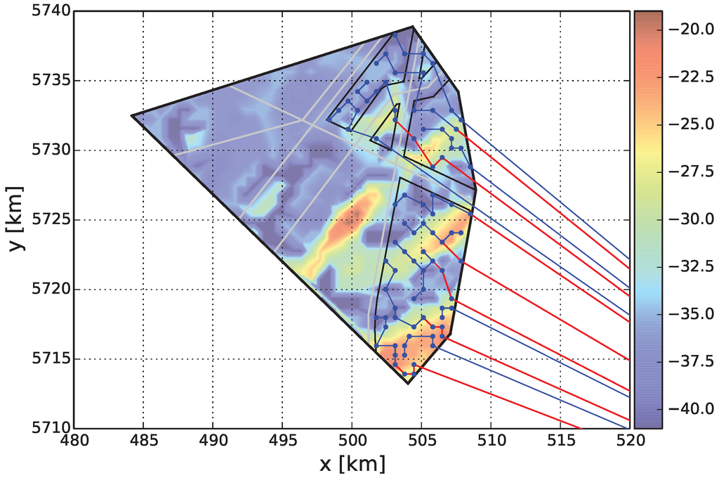 - Berzan, C.; Veeramachaneni, K.; McDermott, J.; O’Reilly, U.M. Algorithms for Cable Network Design on Large-Scale Wind Farms; Technical Report; Tufts University: Medford, MA, USA, 2011. [Google Scholar]