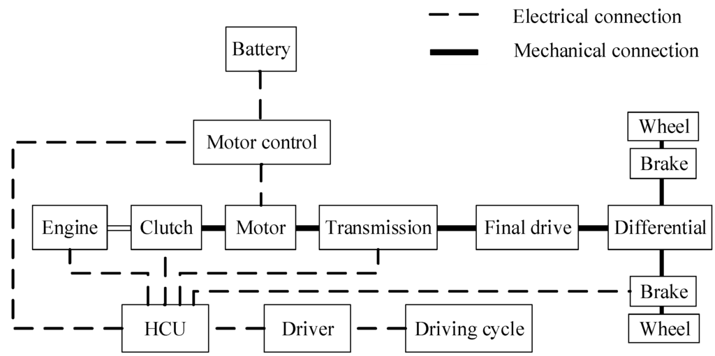 To face the challenge of air pollution, dependence on petroleum, and greenhouse gas emissions, research on improving the performance of electric vehicles (EVs) and hybrid electric vehicles (HEVs) to promote the wide range public and private use of them has been conducted for decades. The performance and energy economy of EVs and HEVs are influenced by many factors, such as transmission control strategy [1,2,3], traffic environments [4,5], road conditions [6,7] and driver behaviors [8,9]. Thus, the powertrain control of HEVs plays an important role in accomplishing objectives such as high energy efficiency and low emissions.