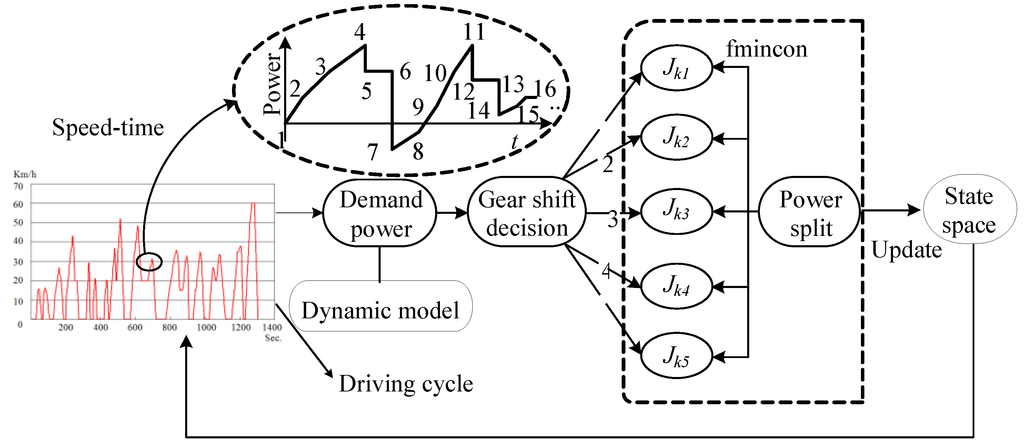 Based on the simplified hybrid drive model, the global optimal strategy can be obtained by solving the recursion Equation (24) backward, with each optimization step constrained by boundary inequalities Equations (11)–(15). Although the simplified model and finite grids are utilized, the value of the cost function needs to be calculated times if the simulation time is t. This will inevitably lead to dimension disaster. Two approaches are adopted in this paper to accelerate the computing speed. One is to calculate the demand power and torque of the HEV in the given driving cycle at first, the longitudinal dynamic model can be replaced by finite demand torque and rotational speed . The other is to find the minimum value of the cost function at each gear, firstly with the fmincon function in MATLAB with the given power split strategy and map out the available real time form. The detailed process is shown in Figure 3. For a given driving cycle, the first approach is used to accelerate the searching process by converting the speed-time graph to the power-time graph. The output power flow is determined by the power split strategy based on finite state machine.