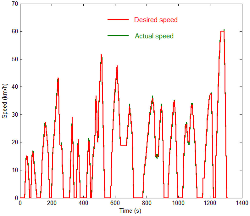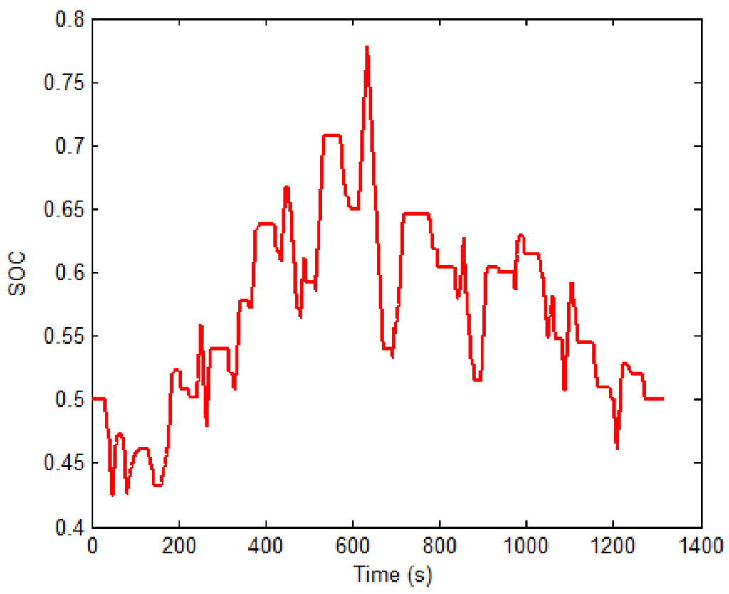 The speed following curves of the test in typical Chinese urban driving cycle is shown in Figure 7. It is shown that the maximum deviation between simulation speed curve (green) and the desired speed curve (red) is less than 1 km/h. This deviation is primarily caused by power interruption during the gear shifting process. Due to the high efficiency of regenerative braking, the battery SOC increases from the initial value 0.5 to 0.62, which can be observed in Figure 8. As shown in Table 1, compared with the conventional two-parameter gear shift schedule, the fuel economy of the optimized extracted gear shift schedule is obviously enhanced and even approaches the benchmark gear shift schedule obtained from DP.