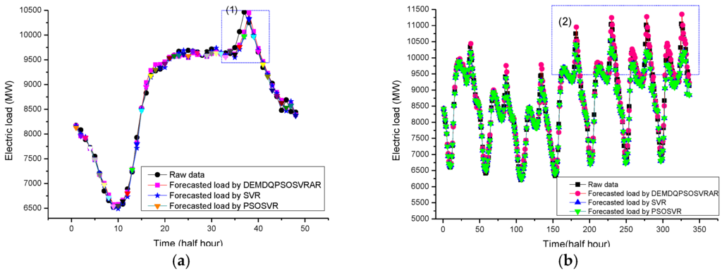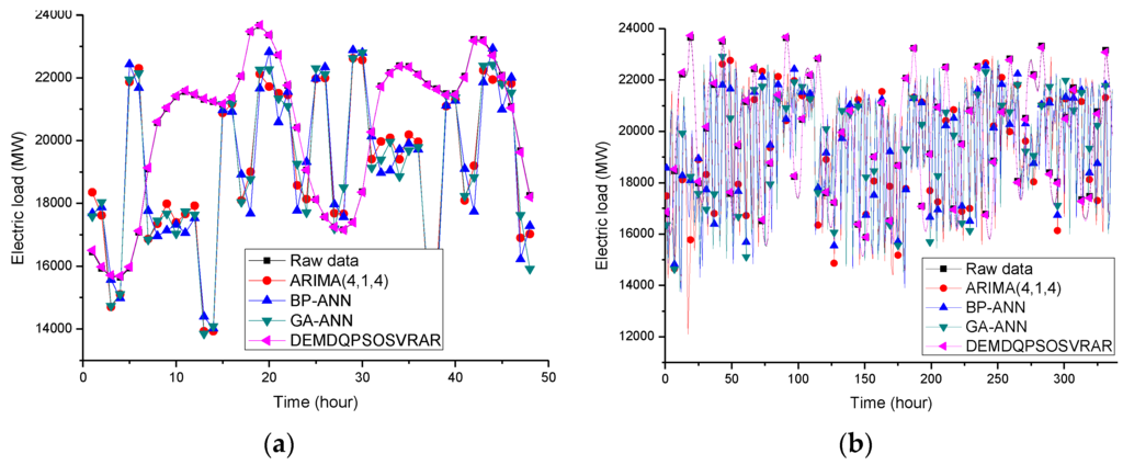 Figure 7a. Based on these two figures, the forecasting curve of the proposed DEMD-QPSO-SVR-AR model seems to achieve a better fit than other alternative models for the two cases in this experiment.