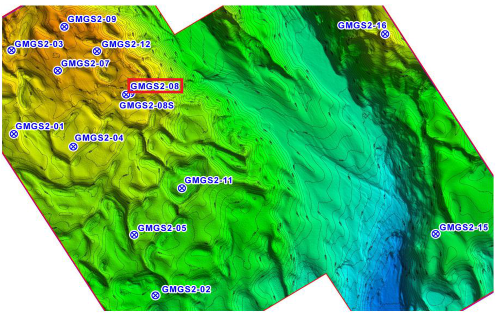 At Site GMGS2-08, double gas hydrate intervals with saturation of 45%–55% have been detected. As shown in Figure 3, gas hydrates were identified at this site in fine grained sediments with vein, nodular, and laminated morphologies. In the shallow part (9.0–23.0 mbsf), a roughly 14 m-thick layer of gas hydrates, widely distributed in the form of nodules and veins, occurs in a range of 9.0 to 23.0 mbsf. In the middle part (58.0–63.0 mbsf), a 5 m-thick authigenic carbonates deposit was found just above the top of the lower hydrate-bearing sediments. In the deep part (63.0–98.0 mbsf), the interval is dominated by silty clay with some partially dispersed muddy carbonates. A 35-m-thick gas hydrate layer, tightly distributed with a massive form, was found in a range of 63.0–98.0 mbsf. Meanwhile, a 20 cm-thick section of pure gas hydrate was recovered in this interval [17]. Ideally, the best natural gas hydrate (NGH) is found in sands, in particular turbidite sands bounded by impermeable shales. This is because the industry already has the tools and the knowledge to produce natural gas from beds like it [18].