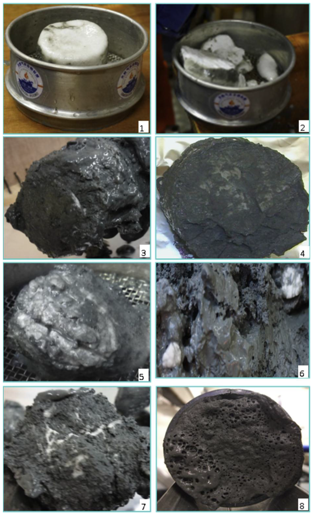 Gas hydrate morphologies in core samples recovered from GMGS2 drilling sites, South China Sea. 1 and 2 (Site GMGS2-08F) massive; 3 and 4 (Site GMGS2-08E) laminated; 5 (Site GMGS2-08E) and 6 (Site GMGS2-08C) nodular; 7 (Site GMGS2-08E) vein; 8 (Site GMGS2-16D) disseminated.