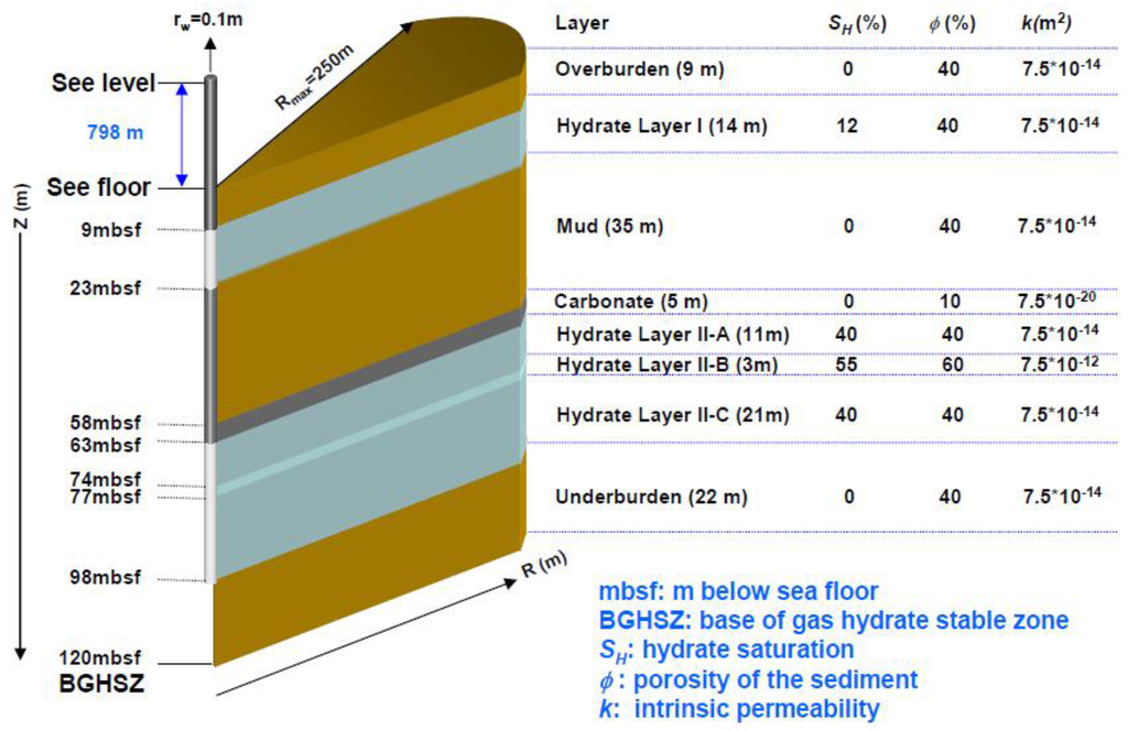 Figure 4 shows a sketch of this system, and provides some basic information on the thickness of the various layers. All the data in Figure 4 are based on the best available data from Site GMGS2-8 of the Dongsha Area [16]. The water depth at the GMGS2-8 site is 798 m. Preliminary available information indicates that there are two hydrate-bearing layers at the GMGS2-8 site. The upper gas hydrate layer (Hydrate Layer I, HBL-I) is 9 m below the seafloor, and the thickness of this layer is 14 m. According to the drilling sample results, hydrate occurs within fine-grained sediments in this layer, and the saturation of the hydrate ranges from 10% to 14%. Thus, in this workhydrate saturation in this layer was selected as 12%. In the middle part (58–63 mbsf), a 5 m-thick authigenic carbonates deposited was found just above the top of the lower hydrate-bearing sediment. The permeability of this carbonates layer is very low. The lower gas hydrate layer (Hydrate Layer II, HBL-II) ranges from 63 to 98 mbsf with a thickness of 35 m, and the saturation of the hydrate in this layer ranges from 30% to 50%. Therefore, in this work the hydrate saturation in this layer was selected as 40%. Meanwhile, the analysis of pressure coring located at the depth of 74–77 mbsf indicates that this interval is rich of massive gas hydrates. A 20-cm-thick section of pure gas hydrate was recovered in this interval. Thus, in the cylindrical system used in the simulations (Figure 4), there is a massive hydrate interval ranges from 74 to 77 mbsf, which is characterized by high porosity, high intrinsic permeability, and high hydrate saturation. The upper hydrate layer is overlain by an overburden with a thickness of 9 m, and the lower hydrate layer is underlain by an underburden with a thickness of 22 m. Meanwhile, there is a 35m-thick mud between the upper and the lower hydrate layers. The cylindrical system extends over an area with a radius of 250 m.