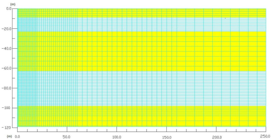The carbonate layer and the low intrinsic permeability of marine clays (muds) precluded the use of horizontal wells. Thus, a vertical well model was used exclusively in this study (Figure 4). The well design is quite simple and involves two perforated intervals that cover the entire upper and lower hydrate-bearing intervals. The well radius in this work is rw = 0.1m. The numerical representation of a constant Pw involves treating the well as an internal boundary. In the case of a vertical well, this boundary is placed in the grid block above the uppermost cell in the well.