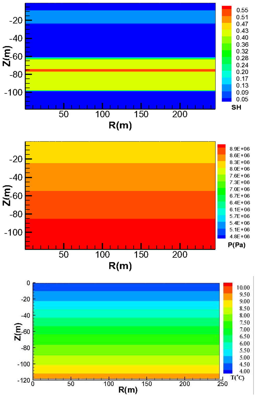 Spatial distributions of hydrate saturation, pressure, and temperatureat t = 0 day.