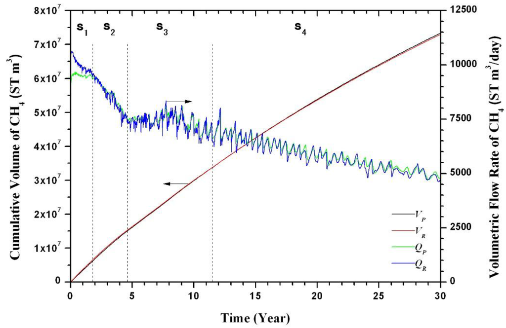 The cumulative released and produced volumes of gas in this figure are consistent with the observations made on the relative magnitude of Qp and QR, and their evolution overtime. The total gas production is approximately 7.3 × 107 ST m3 in 30 years. Thus, the average gas production rate in 30 years is 6.7 × 103 ST m3/day, which is much higher than the previous study in the Shenhu Area of the South China Sea by GMGS-1 (211 ST m3/day) [48].