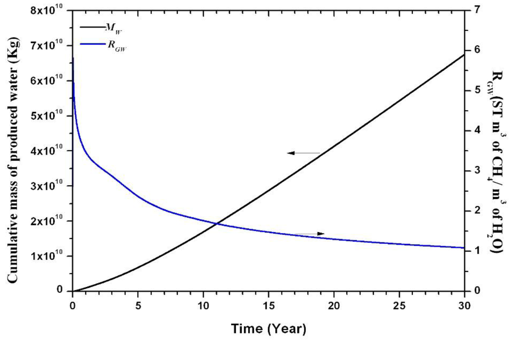 Figure 8 shows the evolution of the cumulative mass of the produced water (MW) and gas-to-water ratios (RGW = VP/MW) overtime. As shown in Figure 8, MW increases continuously, and the rate of water production increases over time. The final MW is 6.75 × 1010 kg, which leads to an average water production rate of 6.16 × 106 kg/day. RGW also presents a continuous decreasing trend. After t = 30 days, RGW is smaller than 5, which is uneconomical [50]. The large amount of water production is mainly caused by the thin overburden of this system. The thickness of the overburden is just 9 meters, and the pressure difference between seawater and wellbore is over 3.5 MPa. Therefore, seawater easily flows through the overburden to the wellbore.