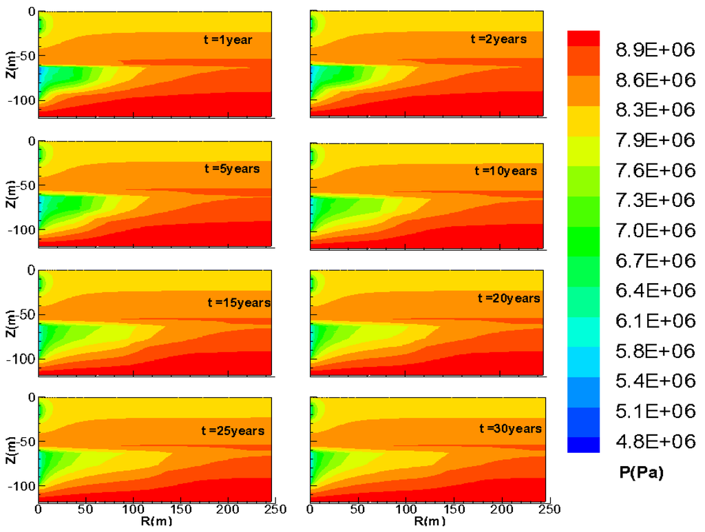 Figure 9 shows the evolution of pore pressure distribution in the hydrate reservoir over time. As shown in Figure 9, the carbonate layer has initially lower permeability than the other layers, resulting in an obvious pressure interrupt between the HBL-II and the middle mud layer. Meanwhile, the 3m-layer of massive hydrate in the HBL-II has initially higher permeability, resulting in a larger pressure drop over a larger distance. As shown, the largest pressure drops in the domain occur near the well and correspond to the hydrate dissociation region. As time advances, the region effected by depressurization increases continuously in the HBL-II. As also shown in Figure 9, the pressure increases in the vicinity of the borehole after 10 years. The reason for this behavior may be that the dissociation gas migrates to the vicinity of the borehole because of the pressure gradient. The high gas saturation causes the increase of the relative permeability in this region before 10 years, which leads to a low pressure area. Afterwards, the decrease of the gas saturation in the vicinity of the borehole leads to the decrease of the relative permeability, causing the increase of pressure in the vicinity of the borehole. However, the pressure distributions in the HBL-I have little change, which indicates the influence by depressurization in the HBL-I has little change over time.