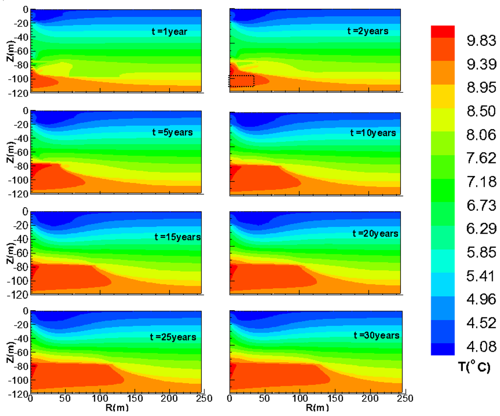 The cooling area expands from t = 1–5 years. Afterwards, it remains unchanged, indicating that the corresponding area for hydrate dissociation also does not expend from t = 5–30 years, or there is an equilibrium between the hydrate dissociation (which may expend) and the heat transport from the environment. On the other hand, the area in the HBL-II near the well is continuously warmed up, and this area gradually expands from t = 1–30 years. This is because the warmer water from the underburden enters the system. The low temperature region (box with black dots line) appears in the figure of temperature distribution at t = 2 years, which is caused by the endothermic nature of the hydrate dissociation. The low temperature region disappears in the next figure, because hydrate in this region is exhausted and the warm water flows from the underburden into the HBL-II. The dissociation of hydrate increases the permeability of the HBL-II, and enhances the mobility of the warm water from the underburden. Therefore, the warm area and the corresponding area for hydrate dissociation expend continually.