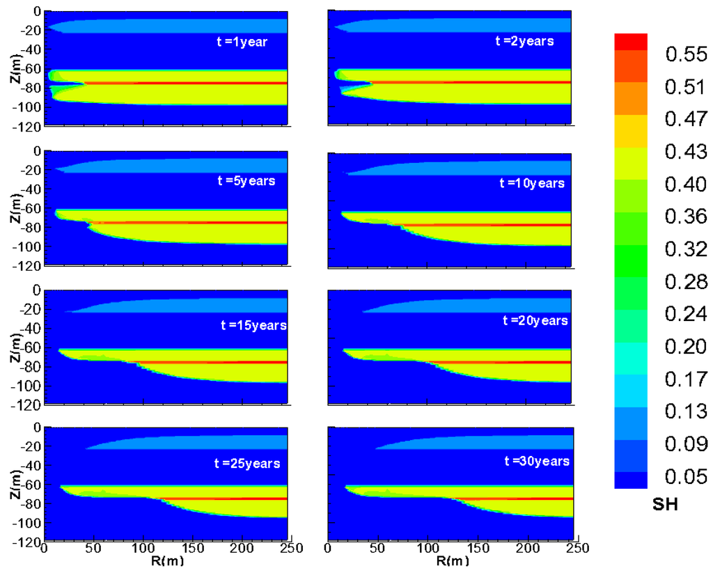 The evolution of SH distributions in Figure 11 shows the progressive destruction of the hydrate through dissociation. As seen in Figure 11, the hydrate dissociation area in the HBL-I expands slowly over time. The reason for the slow rate of hydrate dissociation in this layer is that (1) the pressure gradient for hydrate dissociation in HBL-I is lower than that in HBL-II; (2) the low permeability causes the limitation of the effect region by pressure drop; (3) the cool water from the overburden enters this layer. The change of the SH distribution of HBL-I has already been identified in the P-distribution of Figure 9 and T-distribution of Figure 10.