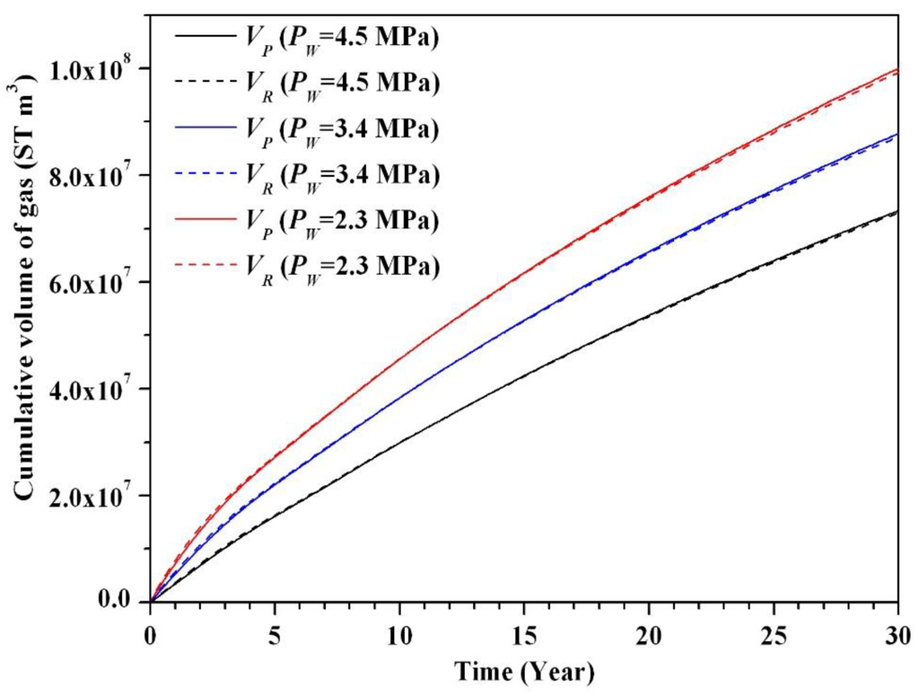 Figure 12 and Figure 13 show the dependence of VP, VR, MW, RGW on the production pressure PW, respectively. As seen in Figure 12, the VP and VR increase with the decrease of the production pressure PW. The finial cumulative volumes of gas production for the cases with the PW = 2.3 MPa, 3.4 MPa, and 4.5 MPa are 1.0 × 108 ST m3, 8.8 × 107 ST m3, and 7.3 × 107 ST m3, respectively. Thus, the corresponding average gas production rates are 9.1 × 103 ST m3, 8.0 × 103 ST m3, and 6.7 × 103 ST m3, respectively. Obviously, the decrease of the PW can enhance the hydrate dissociation rate, which is caused by the larger pressure driving force for hydrate dissociation (difference between the pore pressure and the hydrate dissociation pressure) and the large pressure gradient for the movement of the warm water from the underburden to the HBL-II. When PW decreases from 4.5 to 3.4 MPa, the volume of gas production increases by 20.5%, and when PW decreases from 3.4 to 2.3 MPa, the volume of gas production increases by 13.6%. Additionally, the lowest PW is 2.3 MPa, which is lower than the quadruple point of methane hydrate (2.60 MPa [51]). However, the ice blocking does not happen in this case.