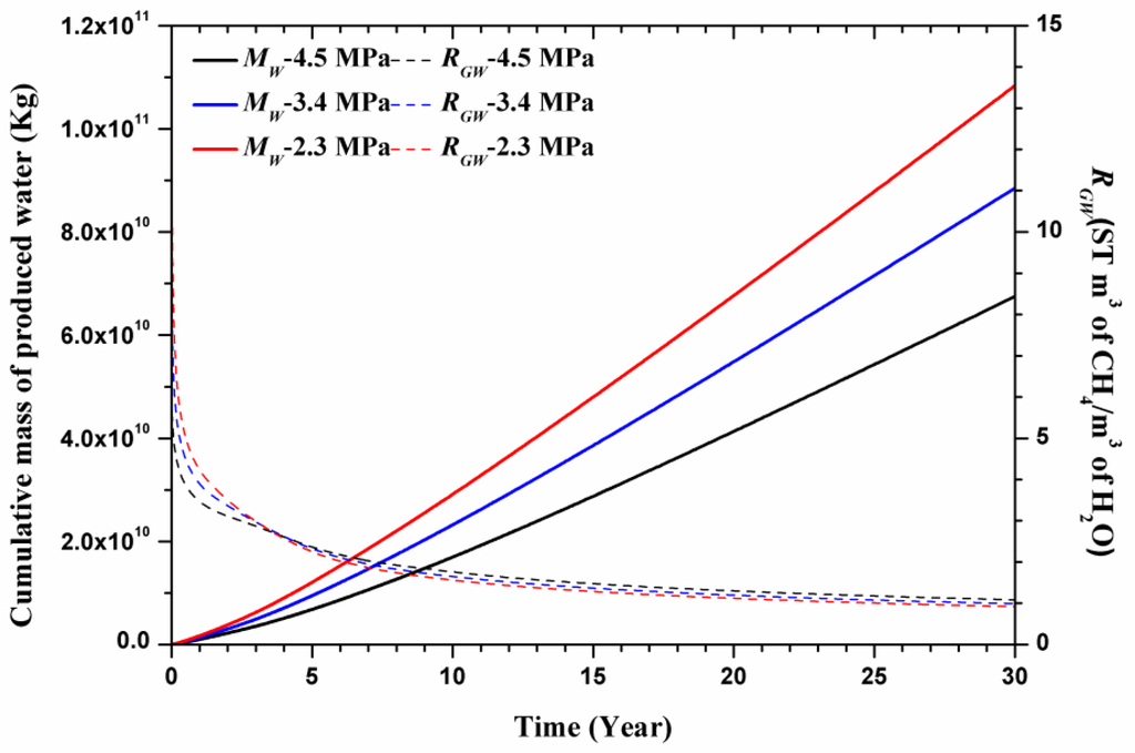 As seen in Figure 13, the cumulative mass of water production increases with the decline of the PW. The finial cumulative masses of water production for the cases with the PW = 2.3 MPa, 3.4 MPa, and 4.5 MPa are 1.08 × 1011 Kg, 8.85 × 1010 Kg, and 6.75 × 1010 Kg, respectively. The RGW in the case with a lower production pressure before t = 3.7 years (1350 days) is higher. However, after t = 3.7 years, the RGW in the case with a lower production pressure is lower. The final RGW for the cases with the PW = 2.3 MPa, 3.4 MPa, and 4.5 MPa are 0.92, 0.99, and 1.09, respectively. The final RGW for these cases are close, because the gas production and water production both increase with the decrease of the PW.