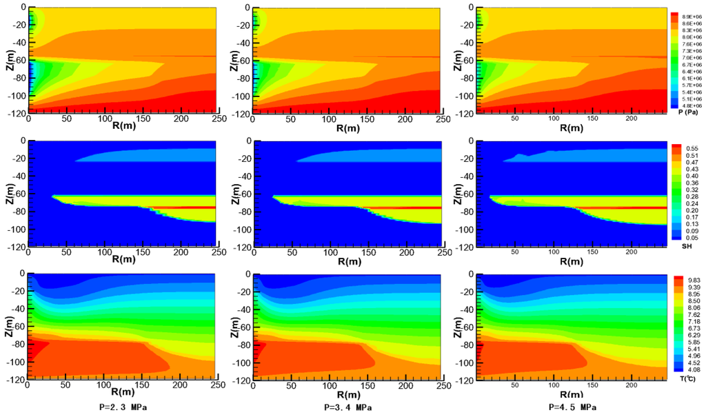 Figure 14 shows the evolution of P, SH, and T distributions at t = 30 years for the cases with the PW = 2.3 MPa, 3.4 MPa, and 4.5 MPa, respectively. As seen in this figure, the regions effected by the depressurization, the hydrate dissociated area, as well as the low-temperature region in the HBL-I and high-temperature region in the HBL-II enlarge with the decline of the production pressure. The reason is that the larger pressure drop can supply the higher pressure driving force for hydrate dissociation, and the lower PW can enhance the flow rates of the water in the overburden and underburden into the hydrate bearing layers. In addition, the temperature distribution in the case with the PW = 2.3 MPa indicates that the temperatures of the HBL do not decrease to the freezing point, even when the PW is lower than the quadruple point.