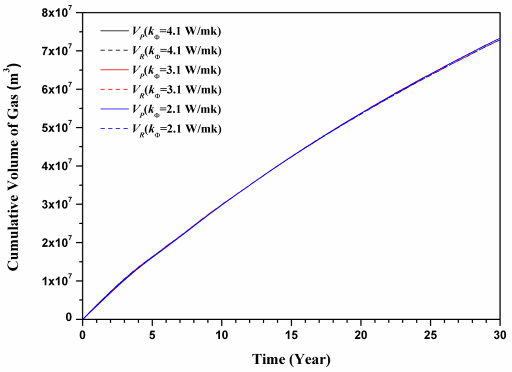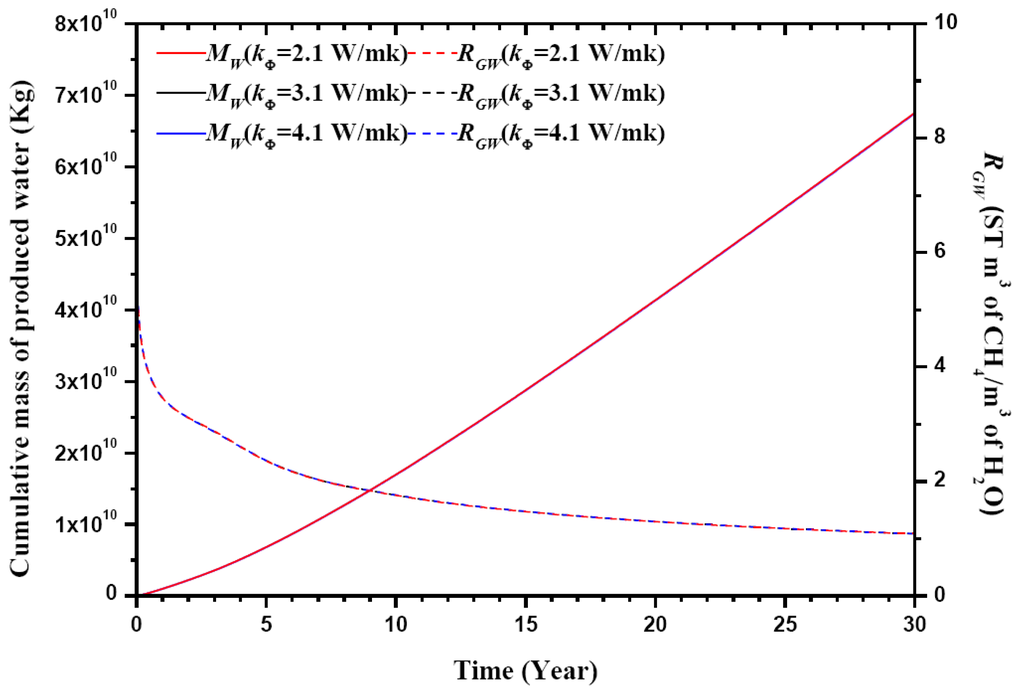 Figure 15 and Figure 16 show the dependence of VP, VR, MW, RGW on the thermal conductivity kΘ (describing fully water-saturated sediments), respectively. As seen in Figure 15 and Figure 16, a change of kΘ from 2.1 to 4.1 W/mK leads to almost no change for the VP, VR, MW, and RGW. This result indicates that the production behaviors are not sensitive for the thermal conductivity kΘ. Thus, the effect of the heat conduction during hydrate dissociation in this case is not obvious.