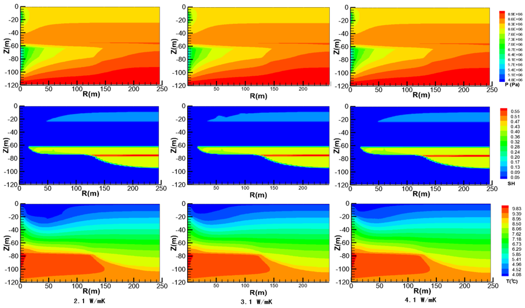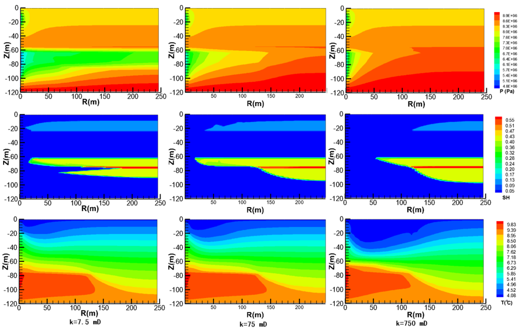 Figure 20 shows the evolution of P, SH, and T distributions at t = 30 years for the cases with the k = 7.5 mD, 75 mD, and 750 mD, respectively. As seen in the figure of P distributions, the regions influenced by the depressurization in the HBL-II enlarge with the decline of the k, and that in the HBL-I is similar in the cases with the different k. As seen in the figure of SH distributions, the dissociated hydrate area in HBL-I enlarges with the increase of the k. However, in the HBL-II, the regions of hydrate dissociation with different k are totally different. In the case with the k = 7.5 mD, the hydrate in the massive hydrate layer is dissociated rapidly, which is on account of the high intrinsic permeability and porosity of this layer. The dissociated region in this layer reaches about r = 180 m, which is the largest among the three cases. However, the hydrate in the other layer of the HBL-II is dissociated slowly. In the case with the k = 750 mD, the dissociated region in the massive hydrate layer only reaches about r = 120 m, but the dissociated region in the layer above the massive hydrate is the largest in the three cases. As seen in the figure of T distributions, the low temperature region in the HBL-I and the high temperature region in the HBL-II enlarge with the increase of k. This is because the reservoir with the higher k can enhance the mass of water from the over- and under-burden. Therefore, in the case with k = 7.5 mD, the hydrates in the HBL-II are mainly dissociated under the effect of depressurization. However, in the case with k = 750 mD, the hydrates in the HBL-II are mainly dissociated under the effect of warm water flow.