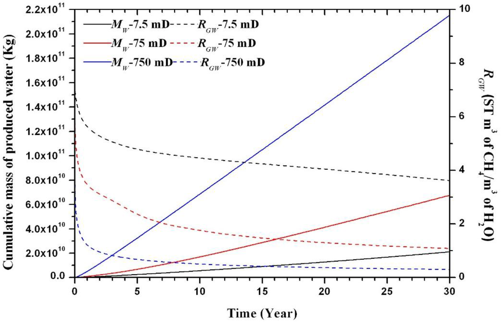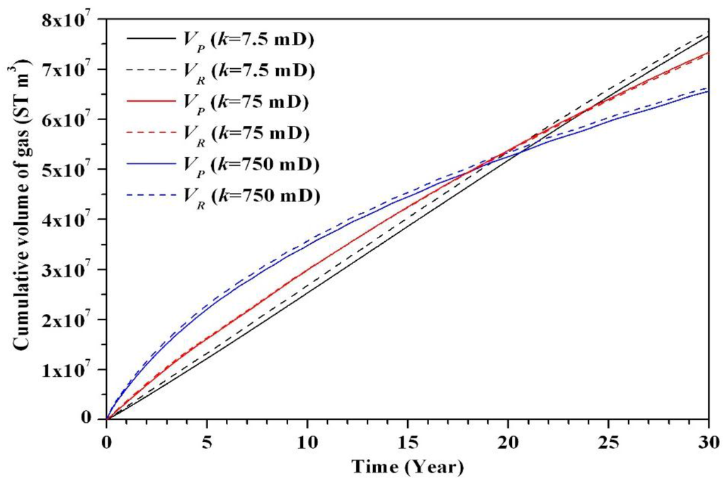 Figure 18 and Figure 19 show the dependence of VP, VR, MW, RGW on the intrinsic permeability k, respectively. In the sensitivity cases, the k of the 3 m-massive hydrate layer (7.5 × 1012 m2) and the carbonate layer (7.5 × 1020 m2) keep no change, and the k of the other layers changes from 7.5 × 1014 m2 (75 mD) into 7.5 × 1015 m2 (7.5 mD) and 7.5 × 1013 m2 (750 mD), respectively.