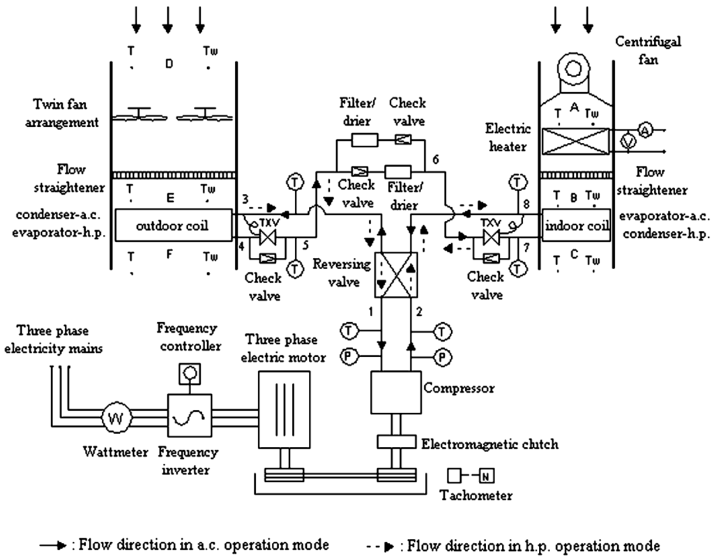Frequency variation technology, a common way to save energy, is also widely used in AC systems. An R134a automotive AC system capable of operating as an air-to-air heat pump is described in Figure 1 [36].