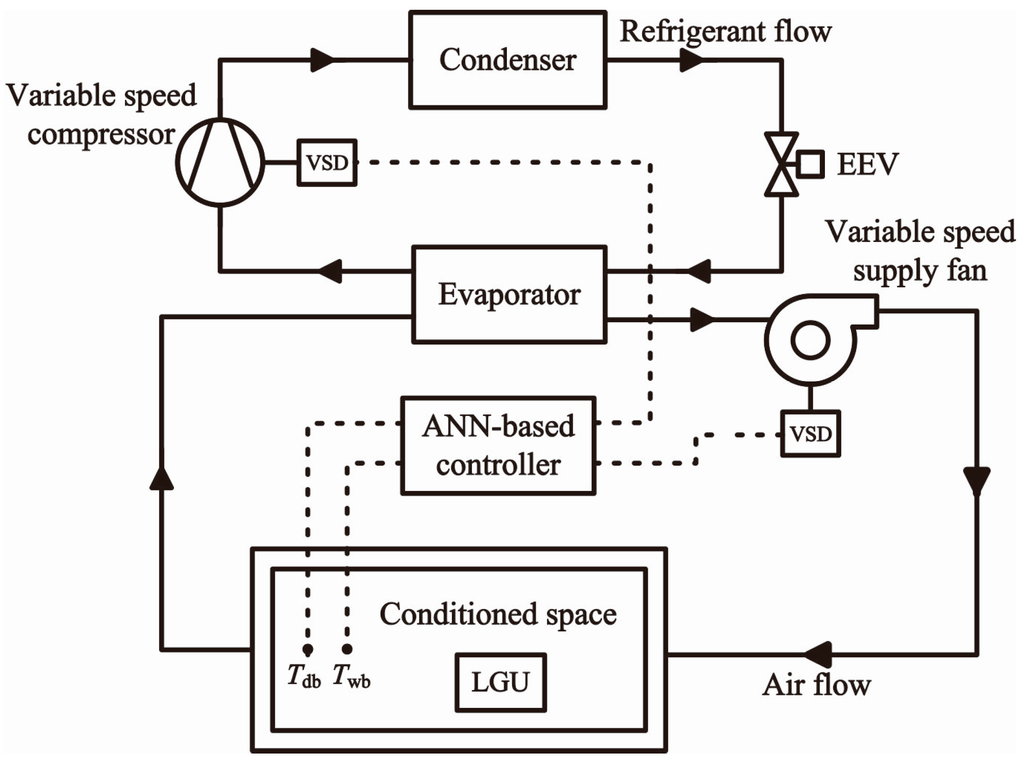 Advanced control algorithms have also been studied by many authors. Yeh et al. [41] proposed two control algorithms. The first algorithm, which modulated the outdoor fan speed, could enhance the steady-state power efficiency. The second algorithm, which added one more degree of freedom to control by modulating the indoor fan speed, could improve the transient response. The performance of the AC system could be improved if both algorithms were simultaneously implemented in the way that the second algorithm was responsible for the control action during the startup/transient phase of operation, and the first algorithm took over at steady state. Shi et al. [42] described three control algorithms for the inverter AC system: the matrix control, the system-relative commands control and the fuzzy control. Moreover, to realize comfort and system energy efficiency, they explained the mechanism to regulate the running speed of the compressor, indoor and outdoor fans, and the opening of the expansion valve. As shown in Figure 3, an artificial neural network-based controller was developed to simultaneously control the indoor air temperature and humidity by varying the compressor speed and supply fan speed [43]. The controllability tests including command following test and disturbance rejection test showed that the artificial neural network-based was able to track changes in setpoints and to resist disturbances with an adequate control accuracy. Although these control algorithms are mainly applied in building AC systems, in theory, they are also suitable for the AC systems of EVs.