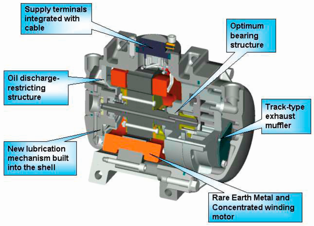 Many scholars have focused on improving the performance of diverse components and parts of the heat pump AC, especially the compressor and heat exchangers. The electric scroll compressor is the most common type used in the AC systems of EVs. It has been widely accepted automakers like Toyota, BYD, Denso and so on [44,45,46,47]. Makino et al. [48] developed an electric compressor with various technologies as shown in Figure 4. This compressor had high reliability, low vibration and noise, small size and light weight, and high efficiency. At the same time, it showed superior comfort and cooling performance, equivalent to that of current engine-driven compressors. To further enhance the electric compressor performance and efficiency, the drive motor was included in [49,50,51]. Besides of the electric scroll compressor, other types of compressors were also proposed for the EV heat pump AC system. Wei et al. [52] presented experimental investigations of an EV heat pump AC system separately integrated with a swash plate variable displacement compressor, a scroll compressor and an electric scroll compressor. For the ambient temperature of −10 °C, the average vehicle cabin temperatures were 12 °C, 10 °C and 5 °C, respectively. The conclusions showed that, when the ambient temperature was below −10 °C, the average vehicle cabin temperature using the swash plate based system was higher than using the other two options. That is to say, the swash plate variable displacement compressor is a good choice for an EV heat pump AC system in low temperature environments. A type of vane compressor with double working cavities that was driven by a frequency modulated electric motor was designed in [53]. There was no obvious difference in performance between the new compressor and the electric scroll compressor, while the former compressor was distinctive in simple structure, manufacture and assembly. Therefore, it can be applied to EV heat pump AC systems instead of the electric scroll compressor. In [54], a miniature electrically driven turbocompressor was presented. The measurements showed that the heating, ventilation, and AC system with this turbocompressor had an ultra-compact size and high efficiency. Sakai et al. [55] developed a 2-way driven compressor, but this compressor can only be used in hybrid EVs. Although these novel compressors were developed, there are more tasks that must be completed before they can be widely applied in EVs, except for the electric scroll compressor.