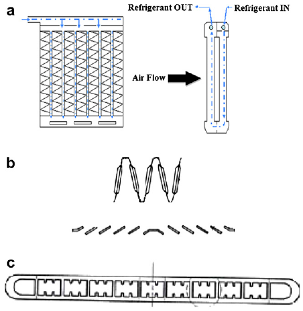 Schematic diagram of the microchannel evaporator: (a) Front view (left) and side view (right) of the microchannel evaporator; (b) Louver fin used in the microchannel evaporator; (c) Microchannel tube [60].
