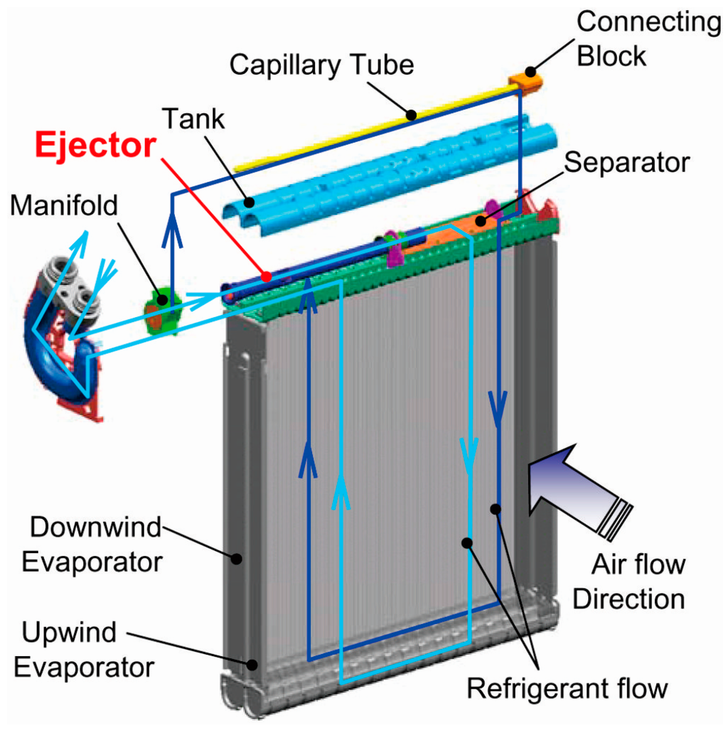 - Brodie, B.R.; Takano, Y.; Gocho, M. Evaporator with Integrated Ejector for Automotive Cabin Cooling; SAE Technical Paper No. 2012-01-1048; SAE International: Warrendale, PA, USA, 2012. [Google Scholar]