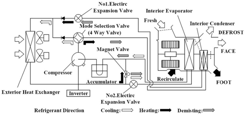 Reforming the integral structure of the heat pump AC system for the EV is also a widely popular approach. Wang et al. [63] adopted three heat exchangers instead of a four-way valve to achieve cooling and heating for an EV cabin. They concluded that the heat pump AC system with three heat exchangers had advantages in demisting and dehumidifying, but the capacity and COP of this system were slightly lower than that of the heat pump AC system with a four-way valve. Suzuki et al. [47] proposed a representative system structure of the AC system for EVs. The construction and mechanism are shown in Figure 7.