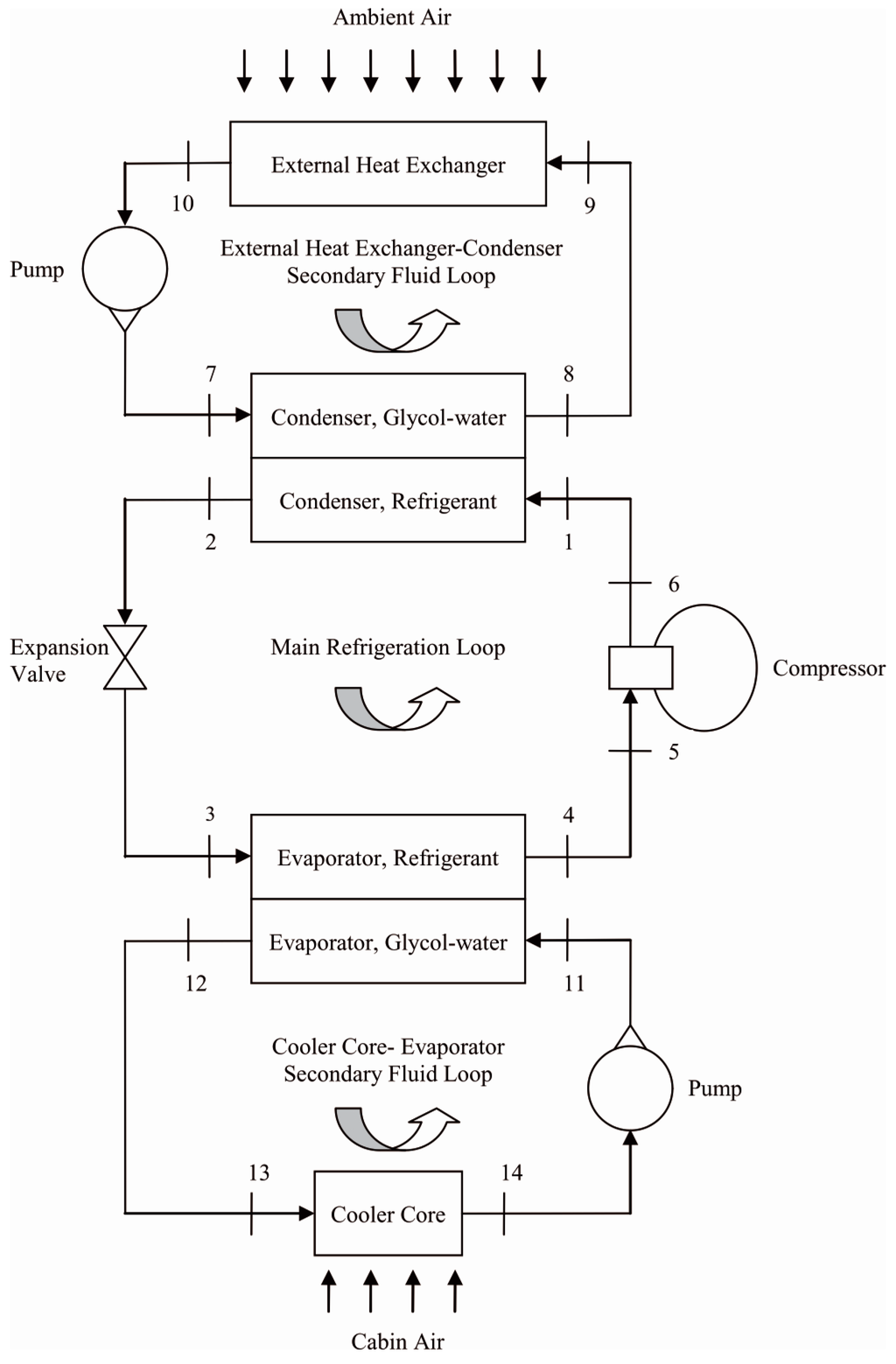 A dual-loop cooling and heating system for automotive applications was designed and fabricated [70,71]. The structure and flow diagram of the dual-loop system in cooling mode are shown in Figure 9 [70]. In addition to the main refrigeration loop, the system had two separate secondary fluid loops using a 50% glycol-water mixture to exchange energy with the refrigeration loop. The experimental results showed that the COP of this system varied from 0.9 to 1.8 in cooling mode, while for the heating mode it varied from 2 to 5, depending on the outdoor air conditions. A heat pump cycle with an economizer and a modified reciprocating was introduced [72]. For mobile application, the heat pump with Voorhees economizer demonstrated better performance compared to the conventional heat pump without economizer when the evaporating temperature is lower than −20 °C. It could increase the capacity at low ambient temperatures of more than two times. Wang [73] took the two-stage cycle technology and applied it in a rail vehicle AC. Li et al. [74,75] presented a low temperature heat pump AC system for fully EVs based on the two-stage compression refrigeration cycle as shown in Figure 10. They studied the characteristics of this system by simulation and experimentation. The results revealed that, when the environment temperature was −20 °C, the system could still run normally with a COP of 1.5. At the same time, it also possessed good performance under standard cooling and heating condition [75]. That is to say, this system could steadily and efficiently extend its operating range.
