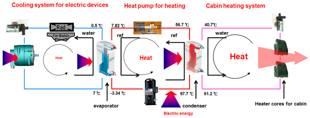 Waste heat discharged from electric devices, such as motors, batteries and inverters of fully EVs, is available. However, it is greatly insufficient for heating the cabin directly. To maximize the use of the waste heat, an integrated climate control system was developed by Groupe Enerstat Inc. [81]. The test results showed that the use of a dual source heat pump, which uses both air and waste heat, was one of the best methods for EVs. Promme [82] proposed a reversible heat pump system with an additional heat source which could utilize the waste heat of the battery, driven electric motor and electronic control unit. Ahn and Woo [83,84] investigated a dual source heat pump (using both air and waste heat) in EVs, which is shown in Figure 11.