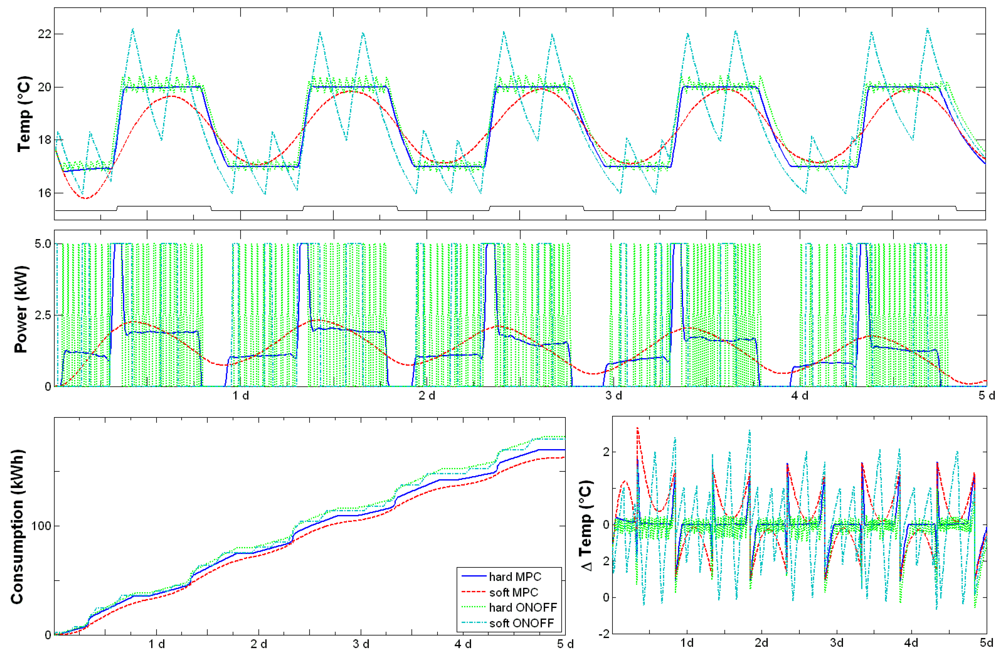 - For the same kind of control, MPC or hysteresis, the energy consumption is greater when the control tries to follow the reference in a hard way. The MPC_SOFT gets an improvement of 7% in the energy consumption respect to the MPC_HARD as can be seen in Table 3.