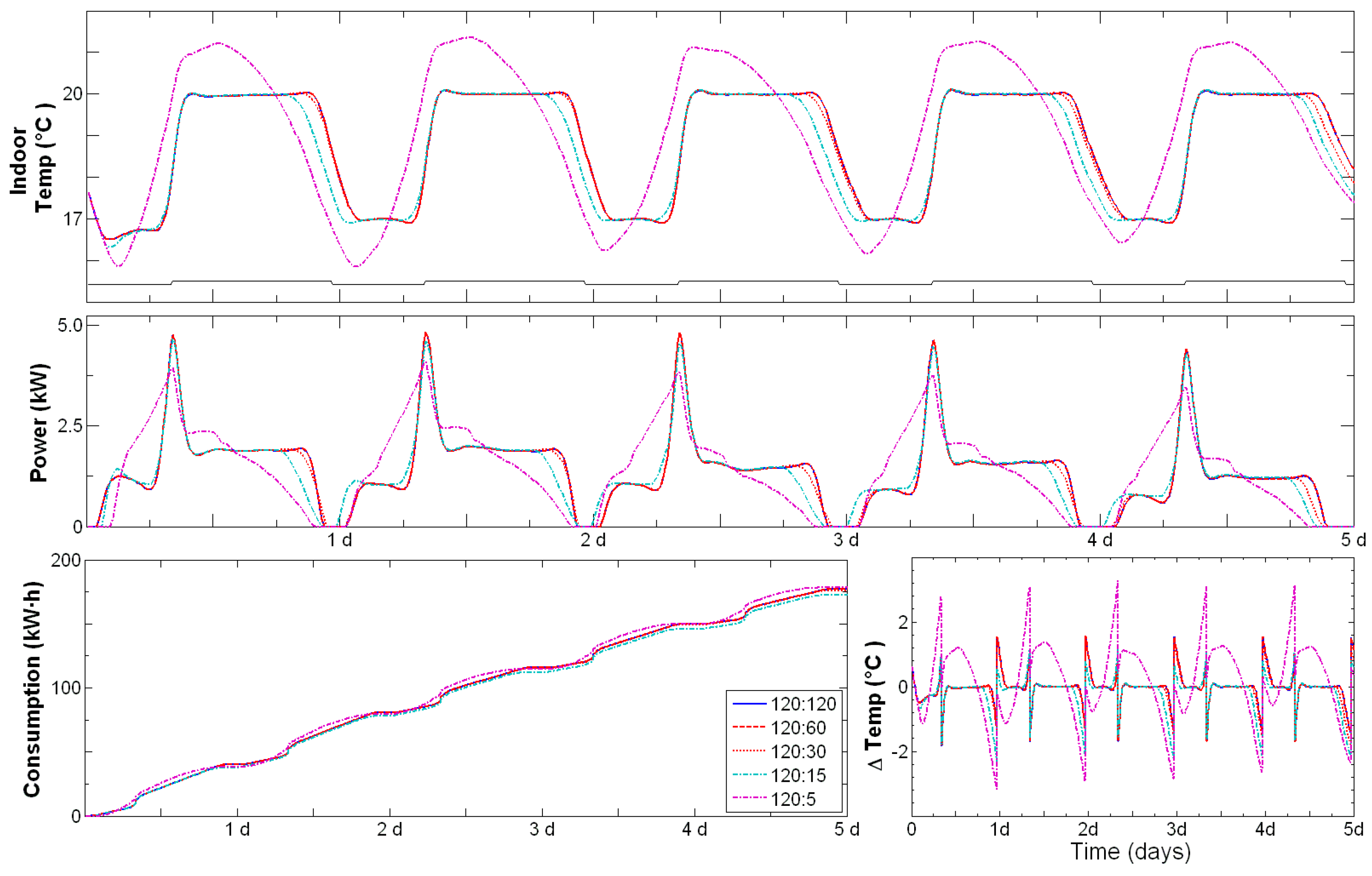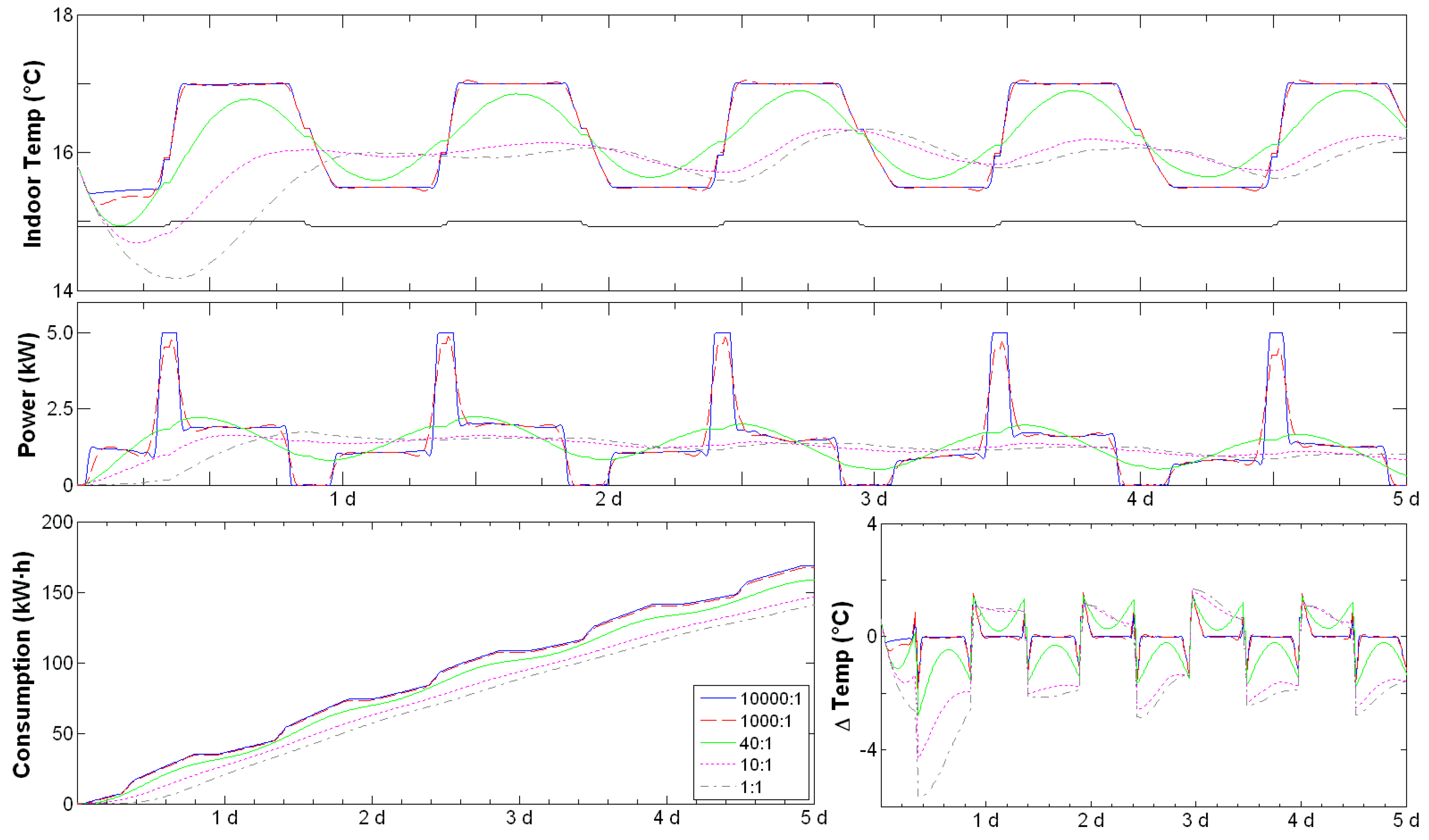 - Verhelst, C.; Logist, F.; Impe, J.V.; Helsen, L. Study of the optimal control problem formulation for modulating air-to-water heat pumps connected to a residential floor heating system. Energy Build. 2012, 45, 43–53. [Google Scholar] [CrossRef]