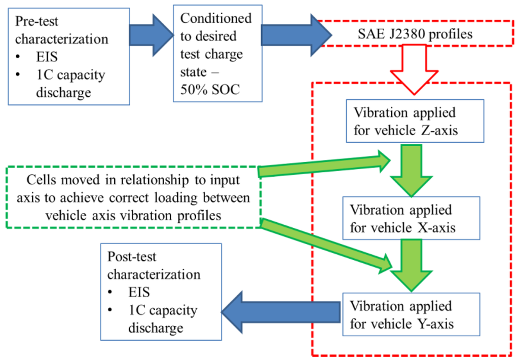 The following section is a summary of the experimental method employed for the vibration ageing of the cells, whose electrical data is used to parameterize the cell models. Additional information with respect to the test fixtures, facility, instrumentation and sample arrangement are defined in [19]. Note that only samples evaluated to the SAE J2380 standard, and assessed at 50% SOC in [19] are employed within this study. The experimental procedure followed during this test programme is summarized in Figure 1.