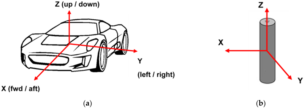 (a) Axis convention of vehicle vibration durability profiles; (b) Axis convention of cells.