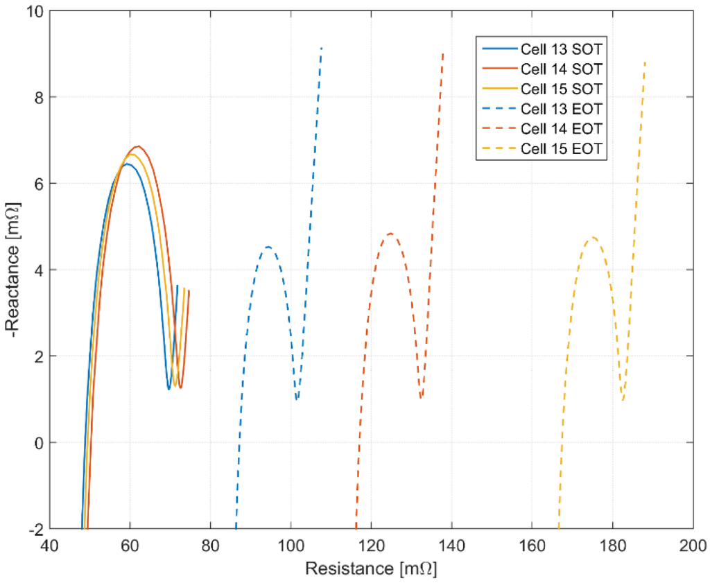 Figure 4 shows the ohmic resistance (RO) of the cells at Start of Test (SOT) and End of Test (EOT) as measured by EIS. A complete explanation of EIS results is beyond the scope of this study and is already well documented in a number of academic and educational texts [27,28]. Figure 4 presents typical Nyquist plots of the cells pre and post vibration test for the cells condition to 50% SOC. Table 3 quantifies the increase in ohmic resistance obtained from the respective EIS data.