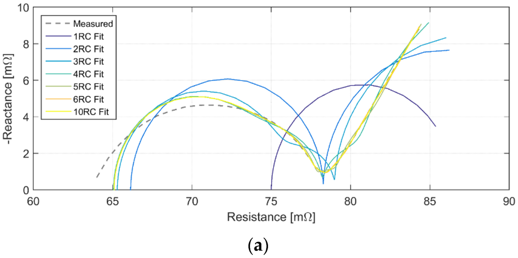 An example of the Nyquist fits for cell 5 is shown in Figure 6a, and the associated errors in Figure 6b. It was found that a 4RC model provides an acceptable fit to the EIS data, with further RC pairs not significantly reducing the error. Several of the RC pairs are required to approximate a resistor-constant phase element pair which would better represent the curve shape, but cannot be easily translated to the time domain [42].