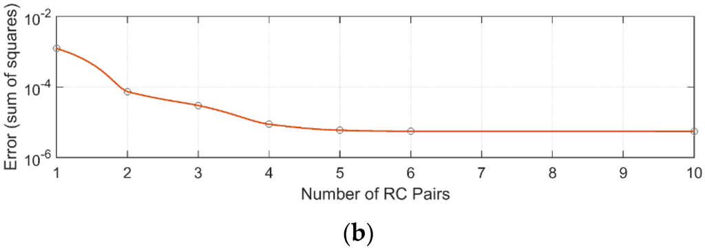 ECMs are not based on physical elements, and as such must be parameterized using system identification techniques rather than taking physical measurements of the cells. Each set of EIS data described in Section 3.1 was used to derive ECM parameters. To obtain the parameters, a nonlinear least squares optimization routine was used to apply the cost function in Equation (13). This adjusts the parameter vector θ in order to minimize the sum-of-squares difference between the experimentally measured impedance ZE, and the model impedance ZM, over Nf frequency points. The model impedance is calculated using Equation (7). The nonlinear least squares algorithm finds a local minimum to the cost function. There may be several local minima and depending on the starting point of the optimization, the global minimum may not be found. To reduce the sensitivity to initial conditions a multi-start algorithm was employed, which runs the local solver several times from different starting points, and then chooses the best solution from all of the runs: