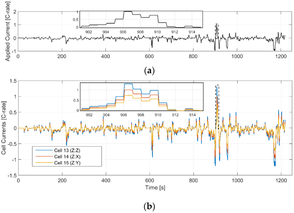 A charge-sustaining drive cycle, typical of a HEV, is used for this simulation. Cells 13–15 are combined in parallel, and maintained at approximately 50% SOC. This drive cycle was derived from real-world driving data and is scaled such that the maximum current is 1C, and the cells started at 51% SOC, and ended at around 49% SOC. Figure 7a shows the applied current and individual cell currents (both as C-rates) for the aged cells, along with a zoomed-in Section. Figure 7b shows the corresponding cell currents. The terminal voltage simulation results in Figure 8 also show that even for aged cells, for a given current input, the calculated voltage out is almost identical to the parallel cell model, with a root mean squared (RMS) error of 0.15 mV.