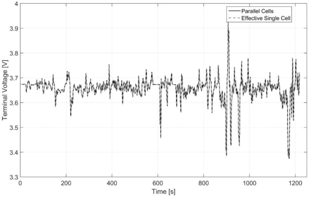 The output voltage can then be multiplied by N to obtain the string voltage. Using the method described and validated in [37], the individual ECMs can be combined into a parallel cell model, with the applied current as the input, and the terminal voltage as the output. Unlike the single effective cell model, this solution does not average out the variations in cell properties, and it means that the current through each cell can be calculated. In the paper, individual ECMs were parameterized from cells with different impedances resulting from charge-discharging cycling-induced ageing. A dynamic current load was applied to the cells while connected in parallel, and individual cell currents were also measured. The same applied load was used as an input to the parallel cell model so that cell currents and voltage could be calculated. The simulated cell currents were found to be accurate to 2% of the measured currents.